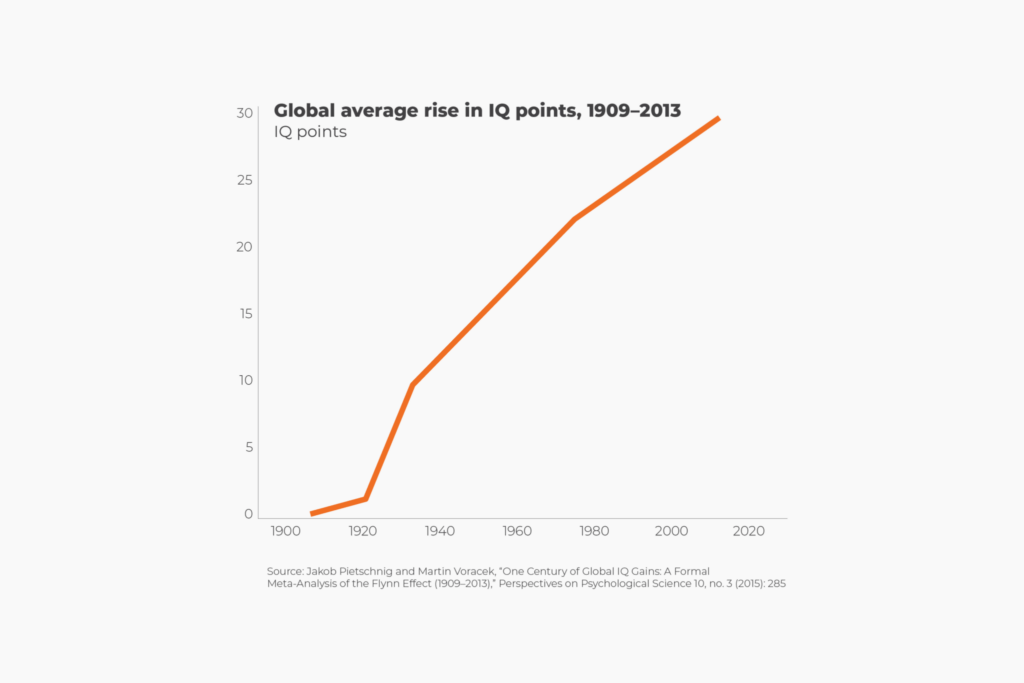 - Cresterea nu reprezinta neaparat o schimbare genetica, ci mai degraba este atribuita factorilor de mediu (educatie, nutritie, sanatate, complexitatea sarcinilor cognitive din viata moderna etc.).